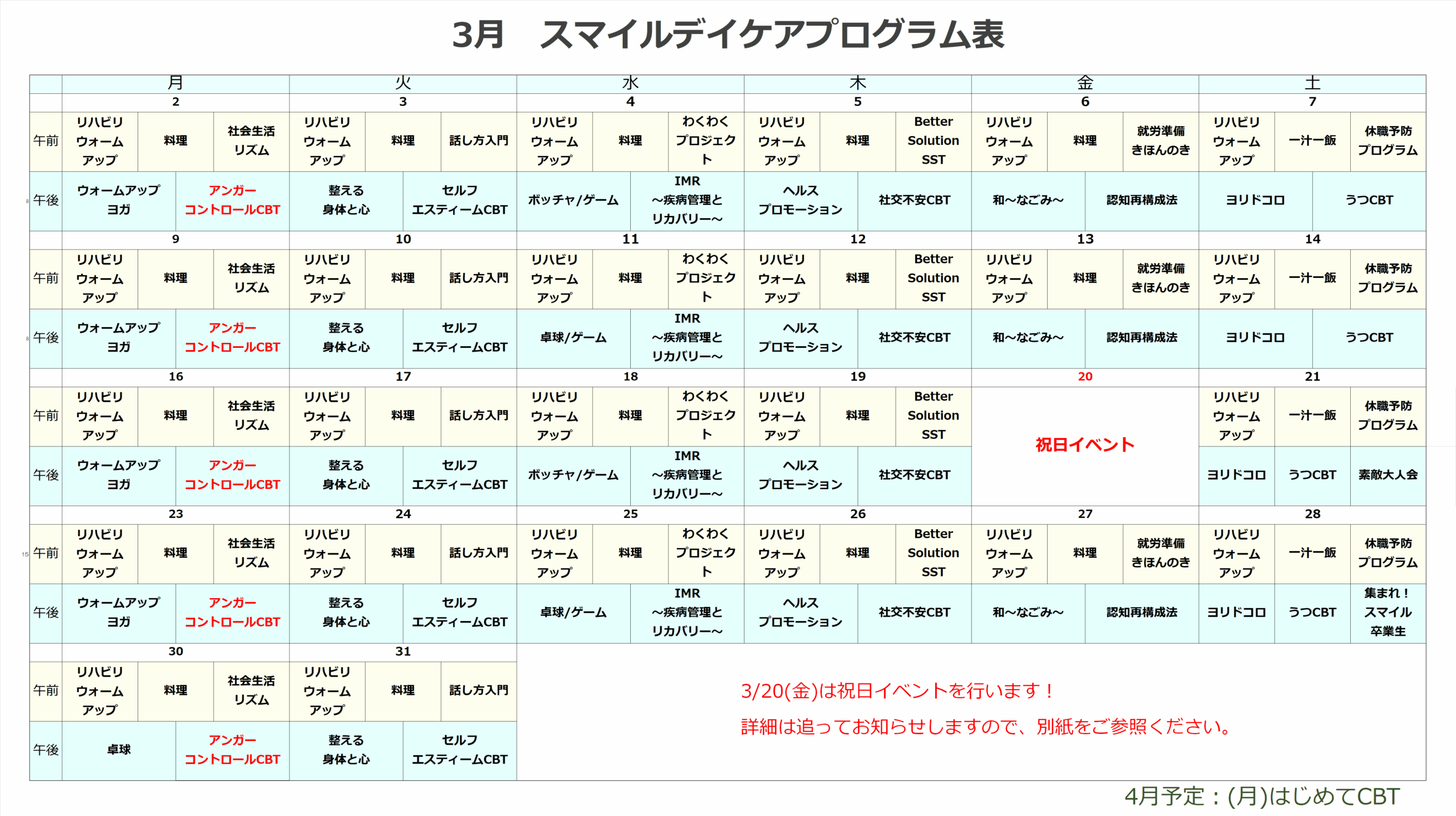 デイケア月間プログラム表を更新しました。
